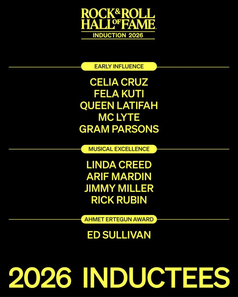 Además de los intérpretes, el Hall of Fame también reconoció a figuras clave en otras categorías. En “Early Influence” aparecen nombres como Celia Cruz, Fela Kuti, Queen Latifah y MC Lyte, destacando su impacto en la cultura musical global.